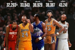 过去八个赛季,杜兰特单赛季场均总得分为1559分。如果我们将这个数字应用到未来,那么他将在下赛季轻松超越科比(33643分)。除此之外,他还需要两个赛季才能超越卡尔·马龙(36928分)。而在超越马龙之后的那个赛季,也就是距今四个赛季的末期,他将有望超越卡里姆·阿卜杜勒-贾巴尔(38387分),在41岁时升至历史得分榜第二位。